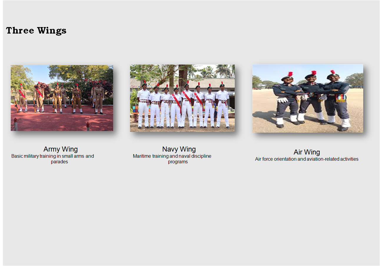 The National Cadet Corps is the Indian military cadet corps with its headquarters at New Delhi. It is open to school and college students on a voluntary basis. The National Cadet Corps in India is a voluntary organization which recruits cadets from high schools, colleges and Universities all over India. The Cadets are given basic military training in small arms and parades. The officers and cadets have no liability for active military service once they complete their course but are given preference over normal candidates during selections based on the achievements in the corps.